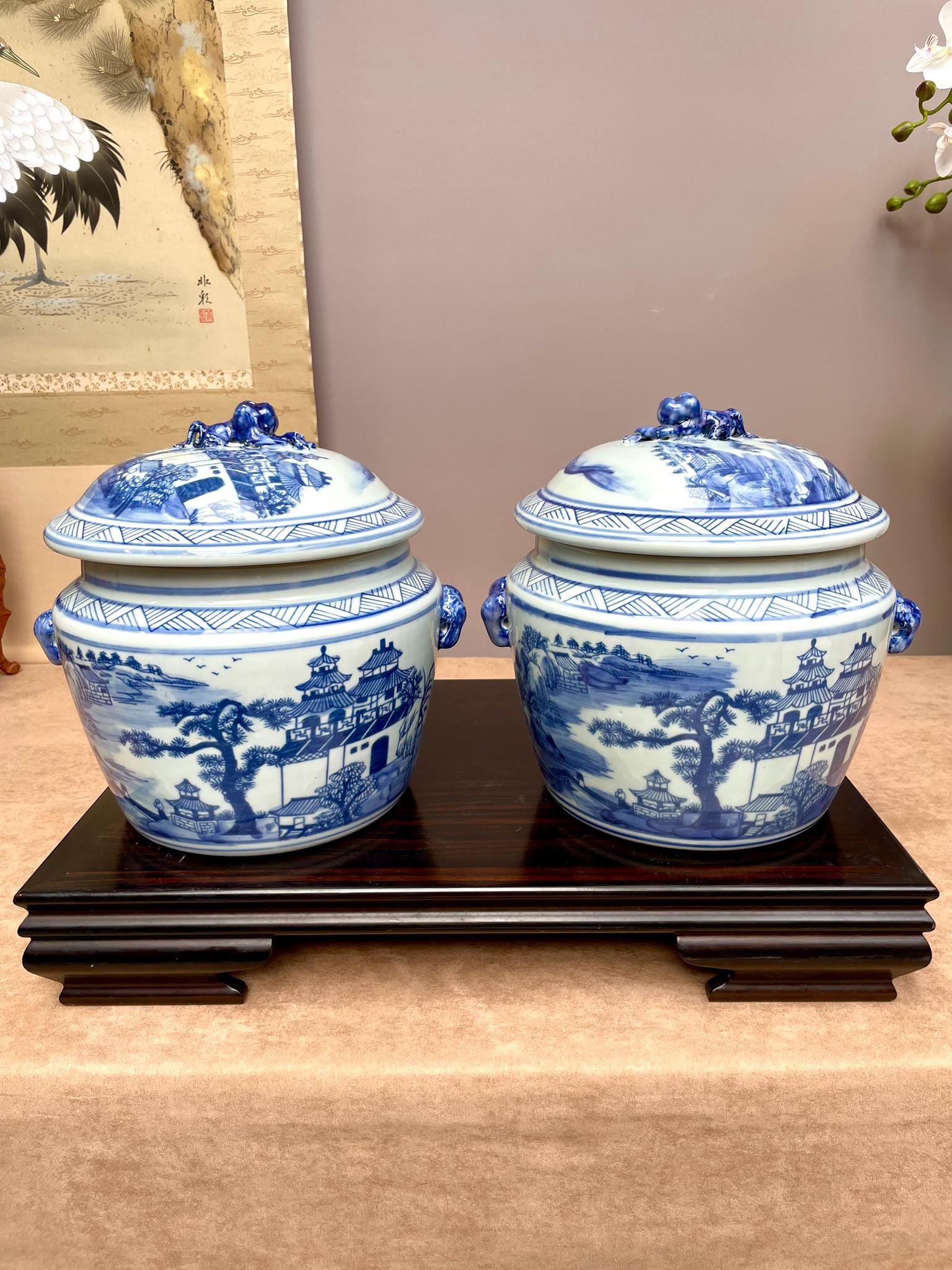 This exquisite pair of blue and white porcelain lidded jars captures the quiet beauty and refinement of Cotswolds country living. Each jar features a rounded form with graceful proportions, crowned with a fitted lid adorned by a sculpted finial. The surface is richly decorated with hand-painted landscape scenes — tranquil rivers, pagodas, and distant mountains — all rendered in deep cobalt blue.