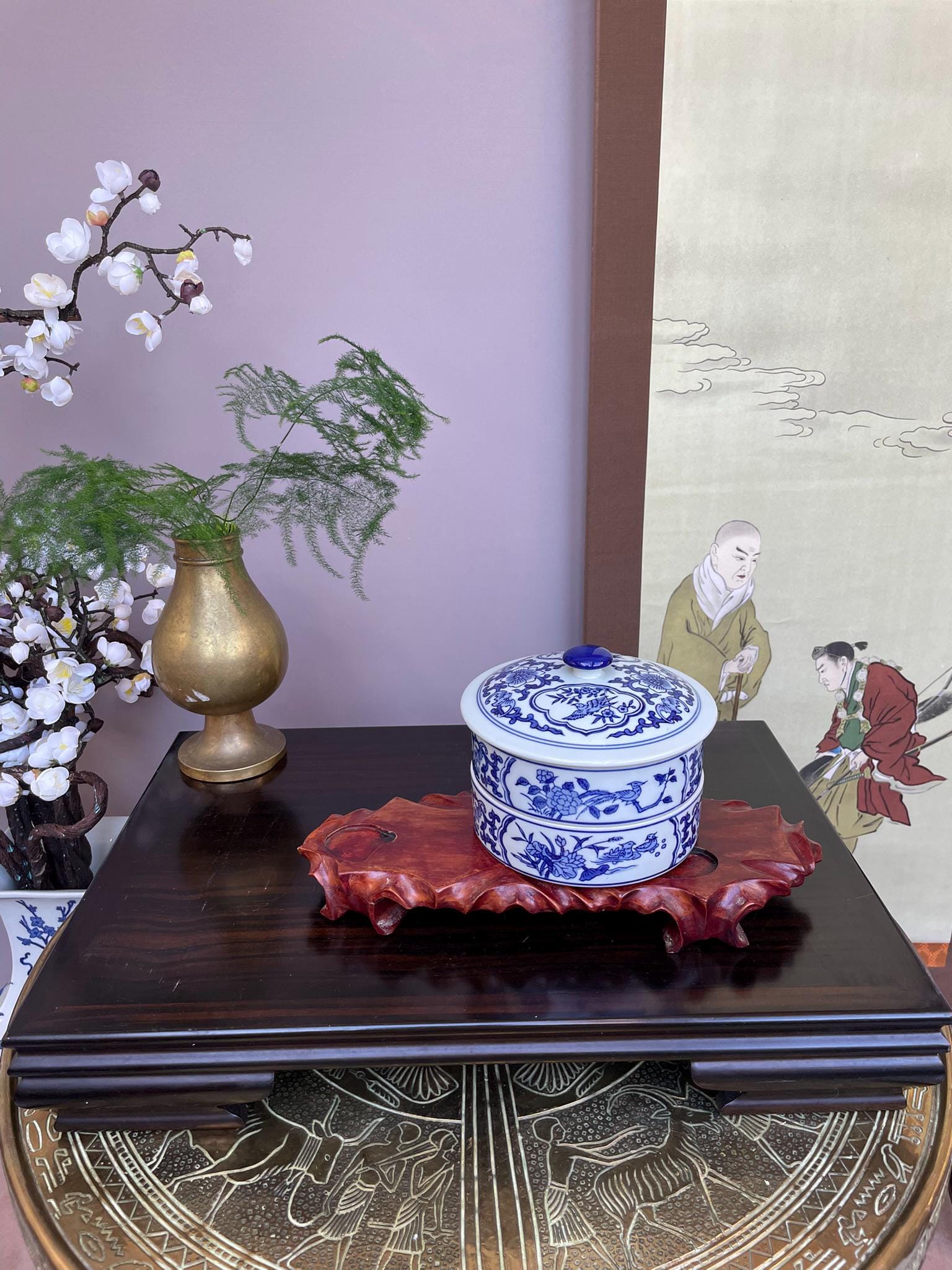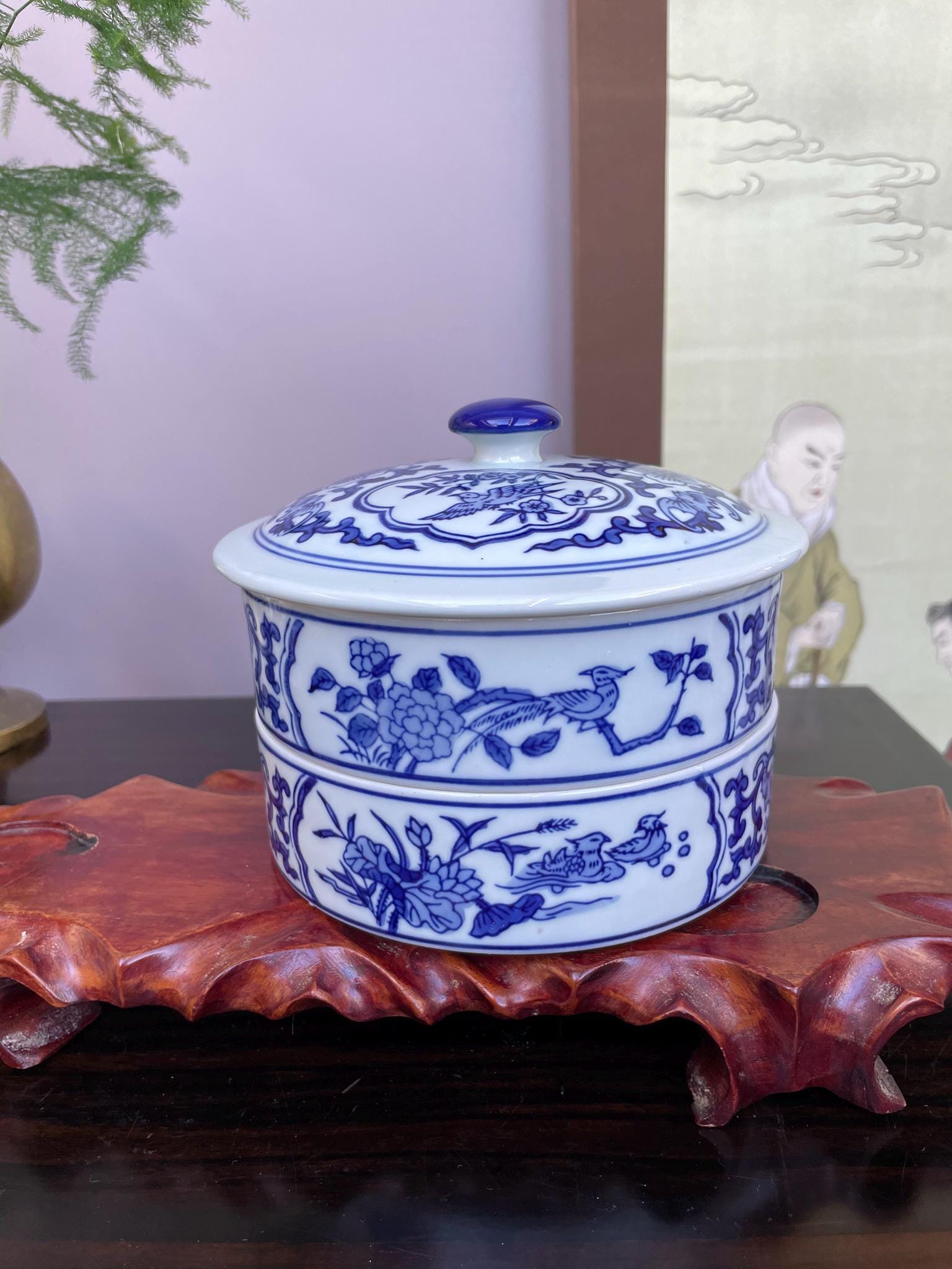 Blue and White Chinese Porcelain 2Tier Lidded Container Hand-Painted Floral & Bird Design Stacking Ceramic Storage Jar Functional Home Decor
