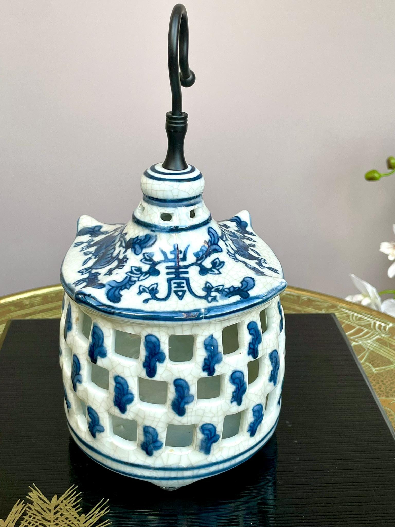 Illuminate your home with this beautifully crafted blue-and-white hanging porcelain candle holder, designed with intricate crackle glaze and elegant pierced windows that cast a soft, patterned glow. This unique lantern-style piece combines classic craftsmanship with functional charm — perfect for adding warmth and artistry to any space.