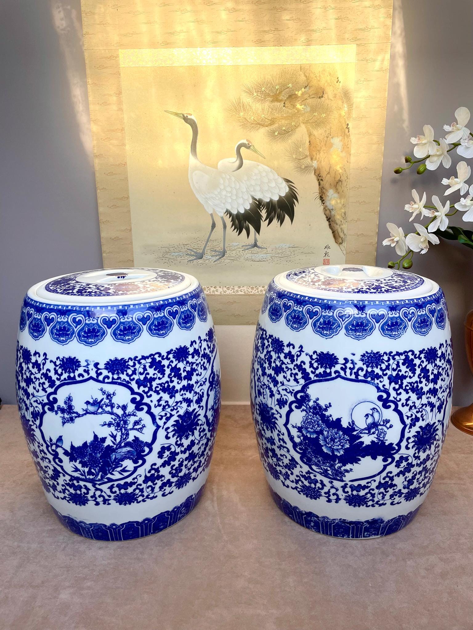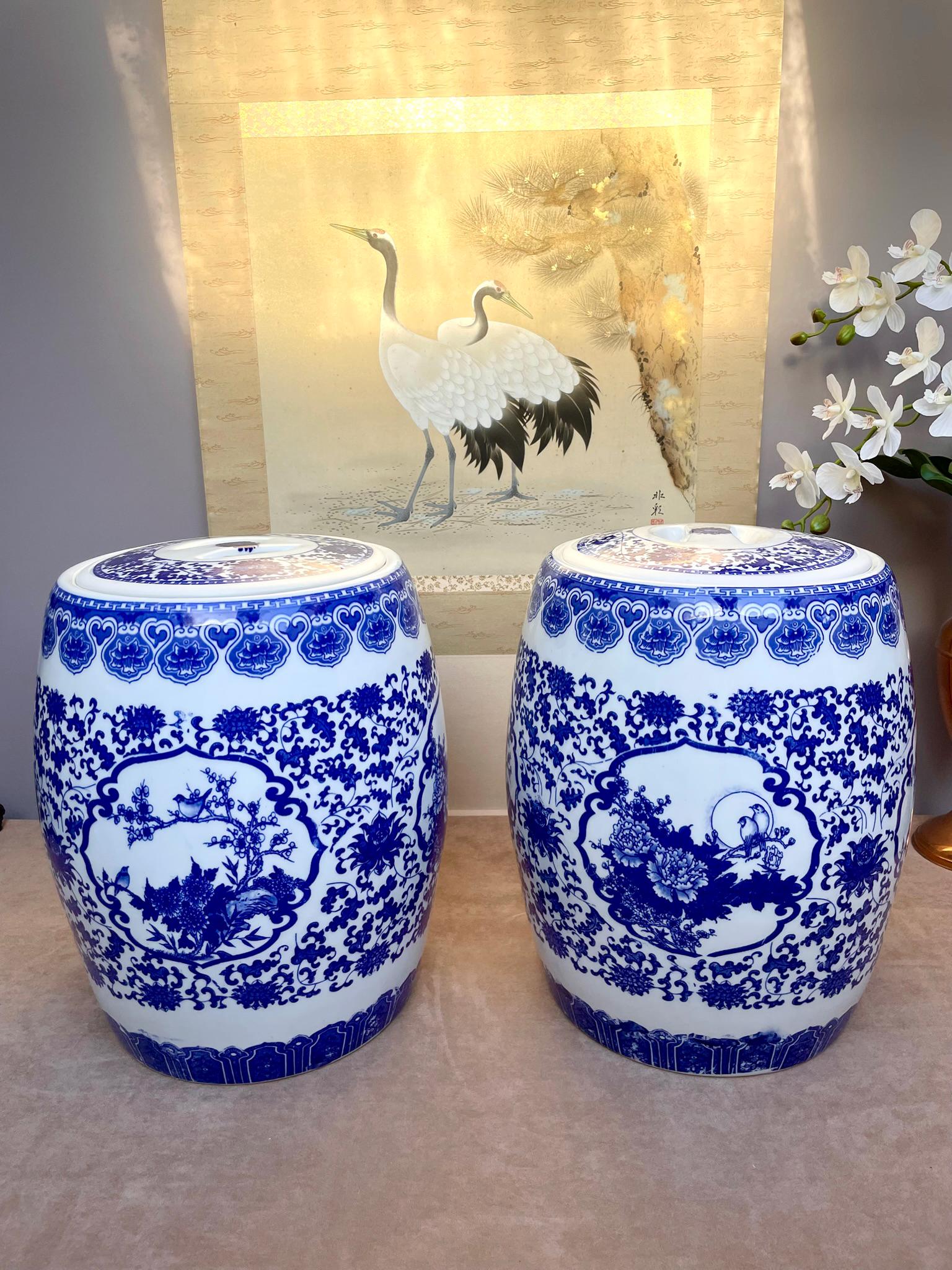 Elevate your home décor with this exquisite blue and white porcelain lidded container, richly decorated in traditional Chinoiserie floral and bird motifs. Each piece features two different scenic panel designs, offering beauty from all sides and making it a standout decorative element in any space.