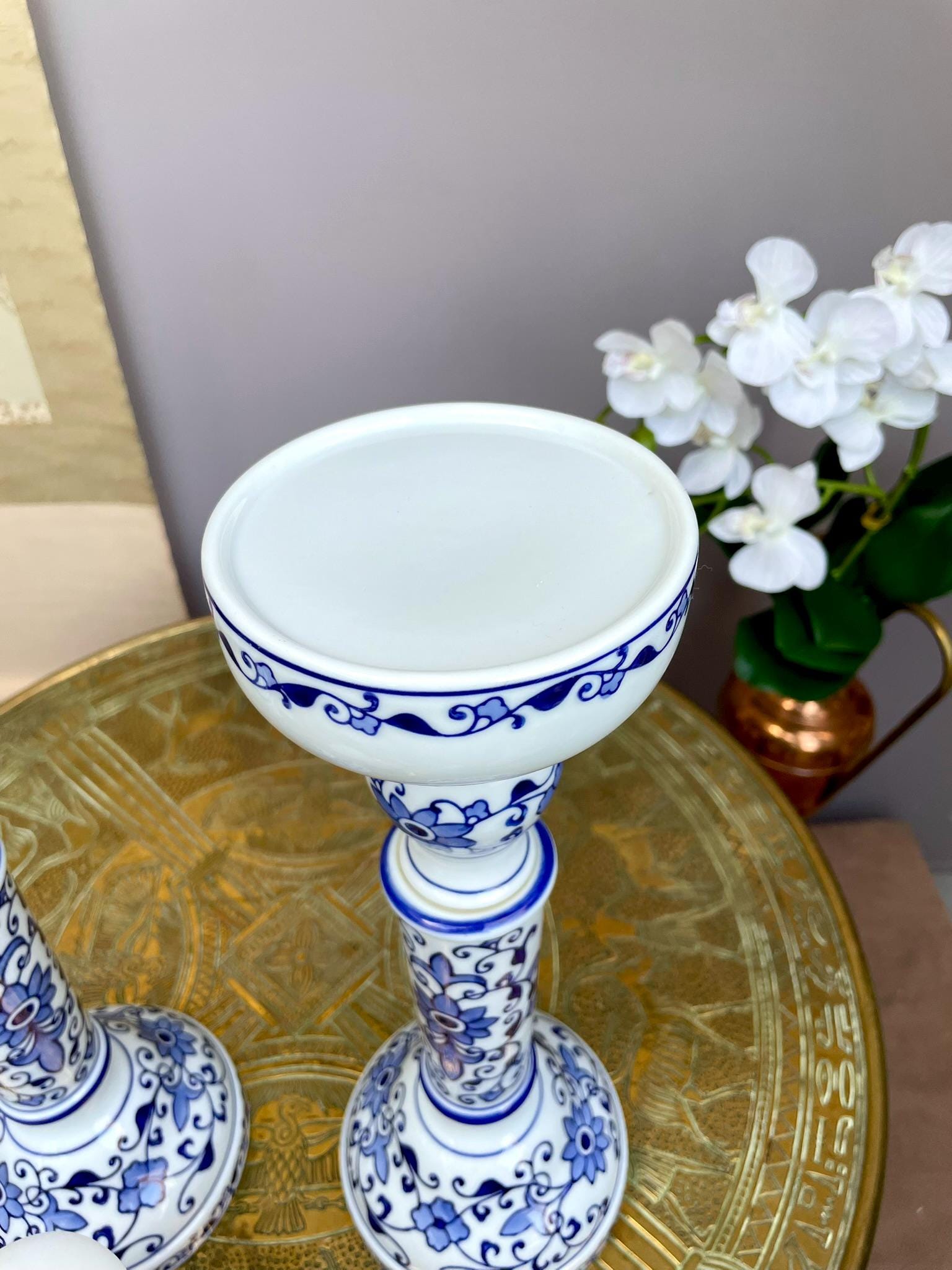 Unlike mass-produced decor, these candle holders are made in small batches, ensuring that every stroke, curve, and detail reflects true craftsmanship. Their tall silhouette adds graceful height to any table, while the timeless blue-and-white palette blends effortlessly with both classic and modern interiors.