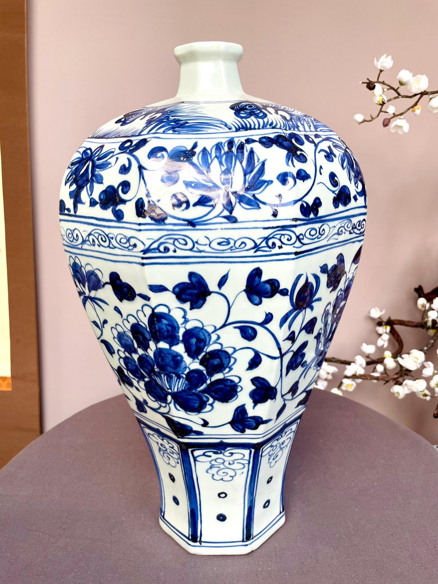 Large Blue-and-White Meiping Vase — A Classic Plum-Blossom Silhouette with Elegant Hand-Painted Motifs