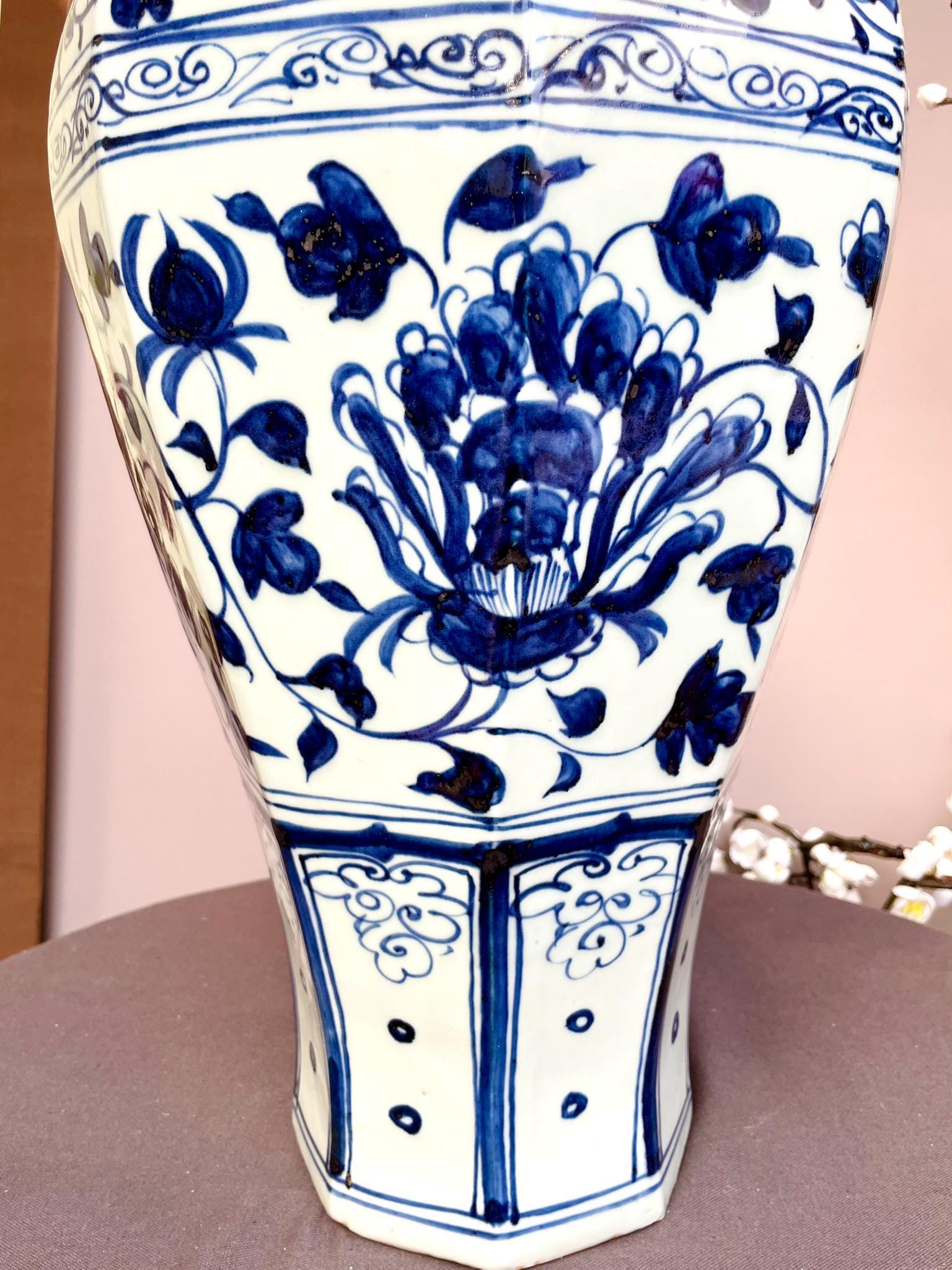 Its size allows it to stand alone as a focal point or to complement other blue-and-white pieces in a curated interior setting.
