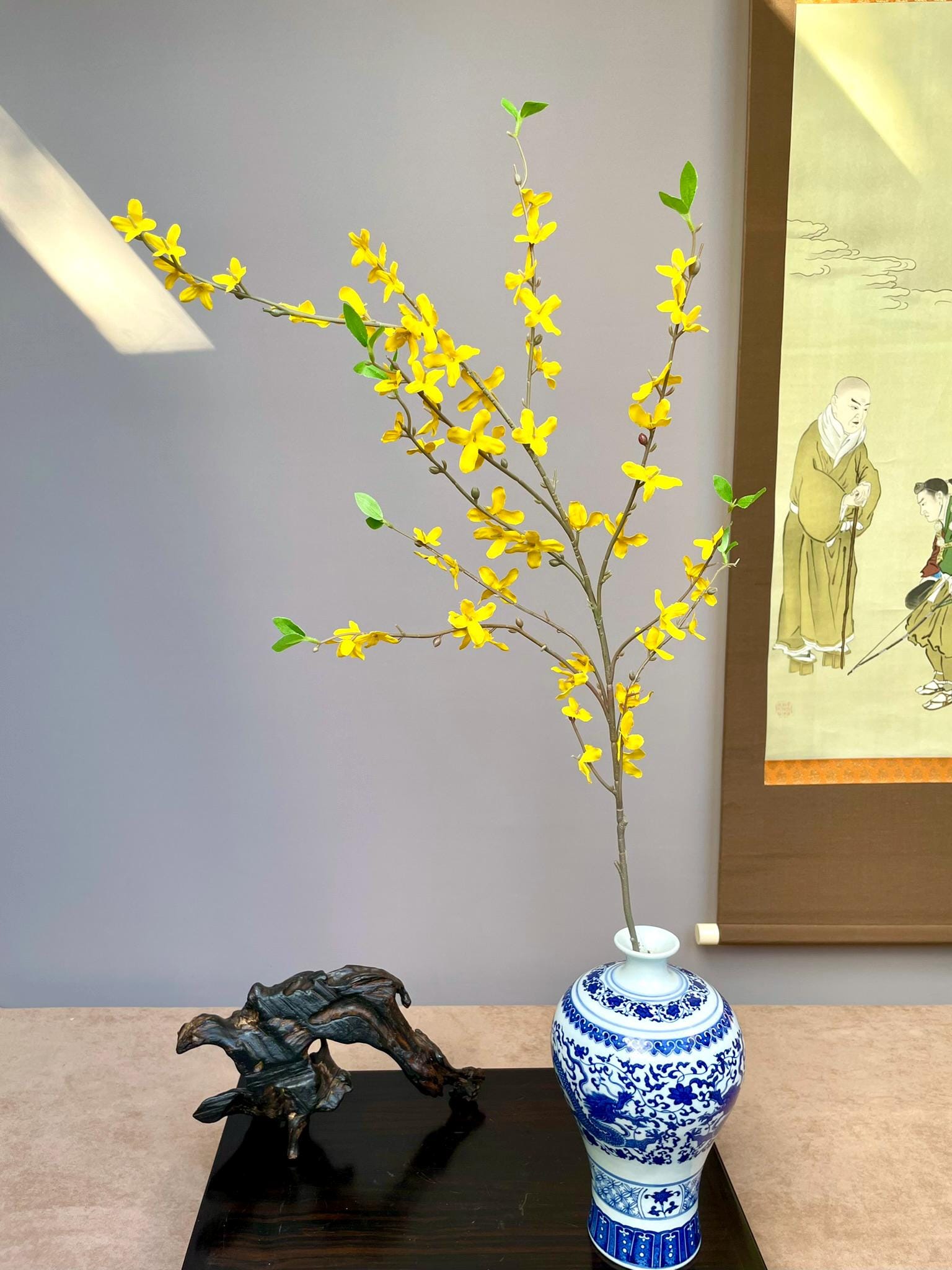 Lighten your interior with this beautifully crafted artificial Forsythia branch, featuring vivid yellow blossoms and naturally textured stems. Designed with attention to realism, each petal and leaf captures the lively color and delicate structure of real Forsythia flowers. This faux floral stem adds a refreshing burst of spring energy to living rooms, hallways, tea rooms, and office spaces—offering long-lasting beauty with no maintenance required.